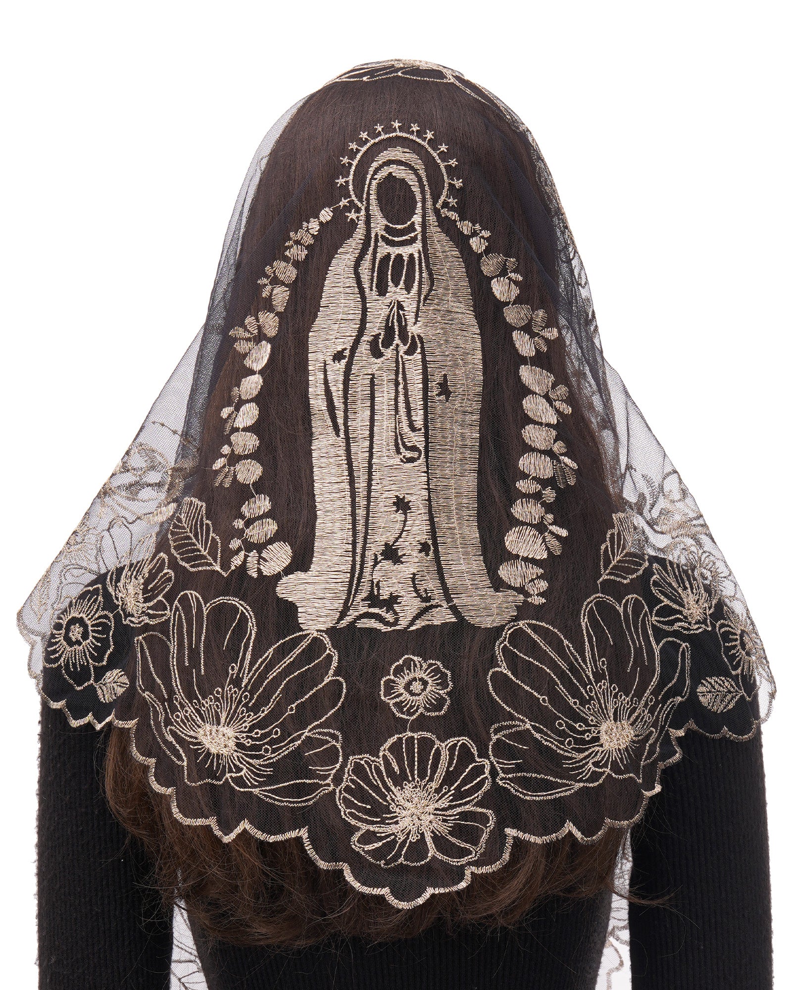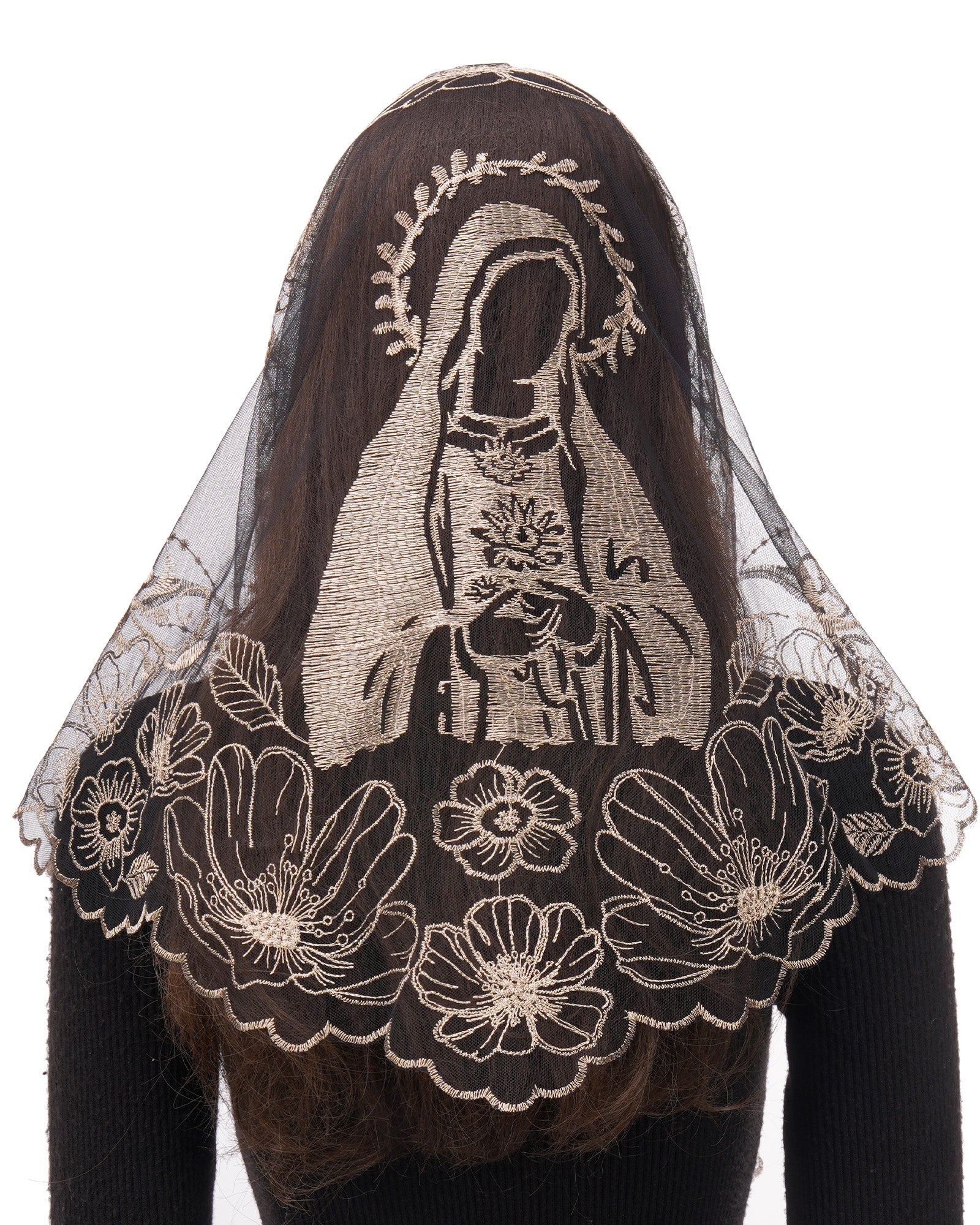 - Exquisite Embroidered: This chapel veil showcases a solemn and beautiful embroidery of the Blessed Virgin Mary in prayer, surrounded by intricate floral and scrollwork patterns — a heartfelt symbol of faith, purity, and devotion