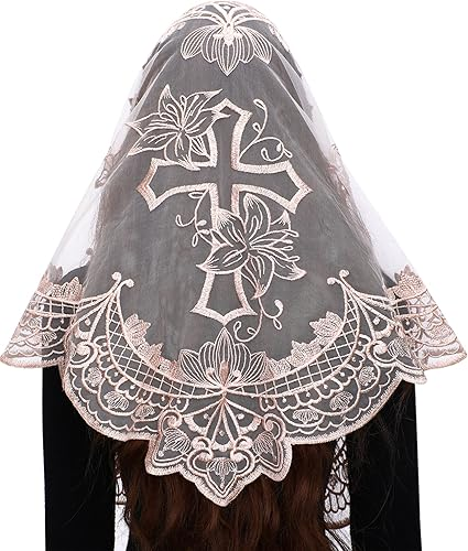 Bozidol Catholic Mantilla Mass Veil - Triangle Cross Embroidery Church Lace Veil Spanish Chapel Mass Head Covering with Clips