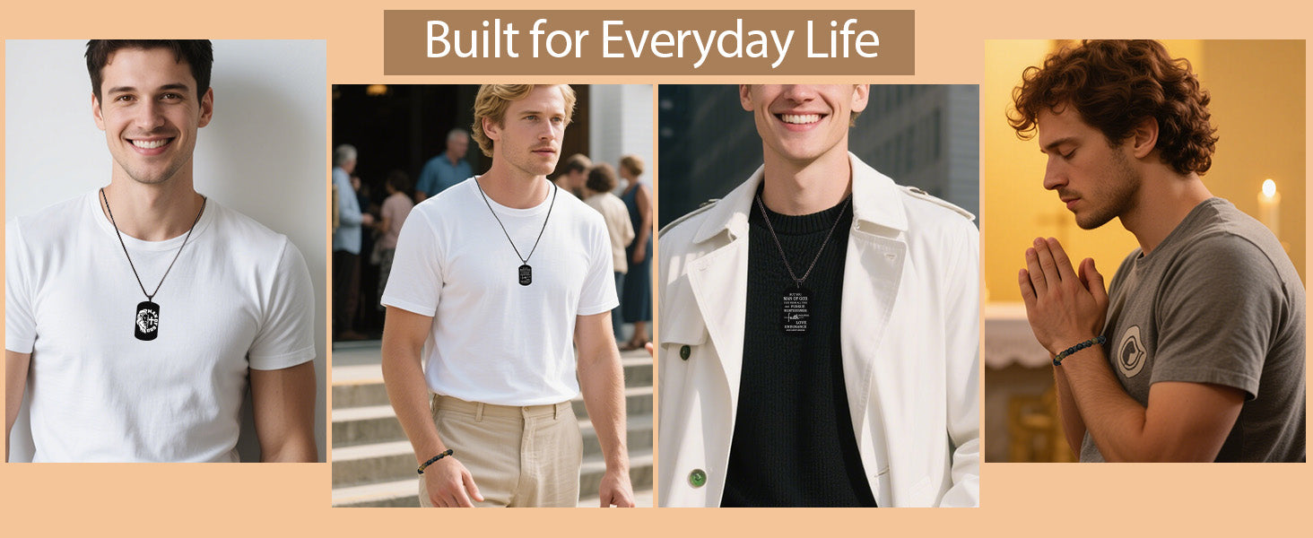 - Inspirational Necklace: The christian necklace features a stainless steel dog tag pendant with "MAN OF GOD" lion and cross on the front and scripture from 1 Timothy 6:11 on the back. A daily reminder to pursue righteousness, strength, and love in God