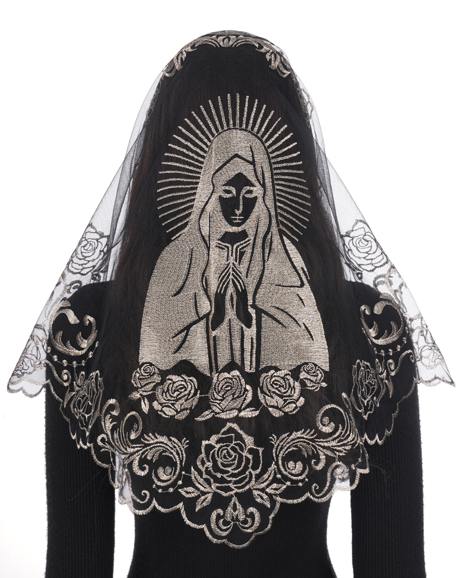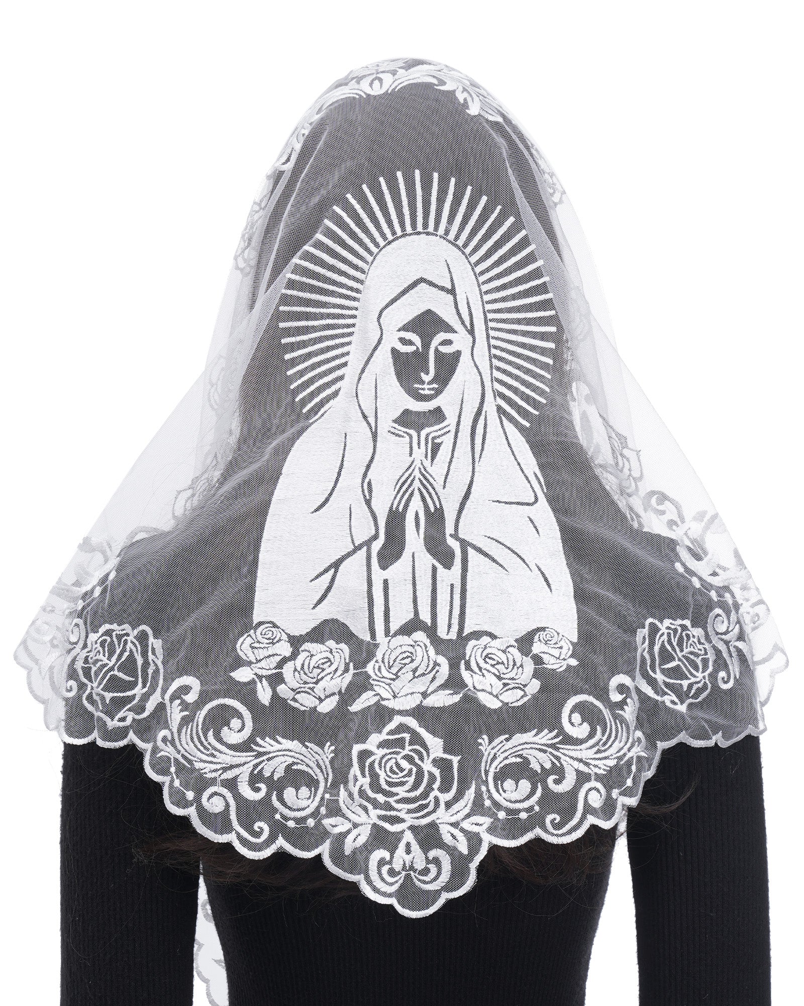 - Exquisite Embroidered: This mantilla veil features a beautiful embroidered Virgin Mary in the center, surrounded by intricate rose patterns and baroque-style motifs. The scalloped edges add a touch of classic elegance, perfect for showcasing faith and devotion