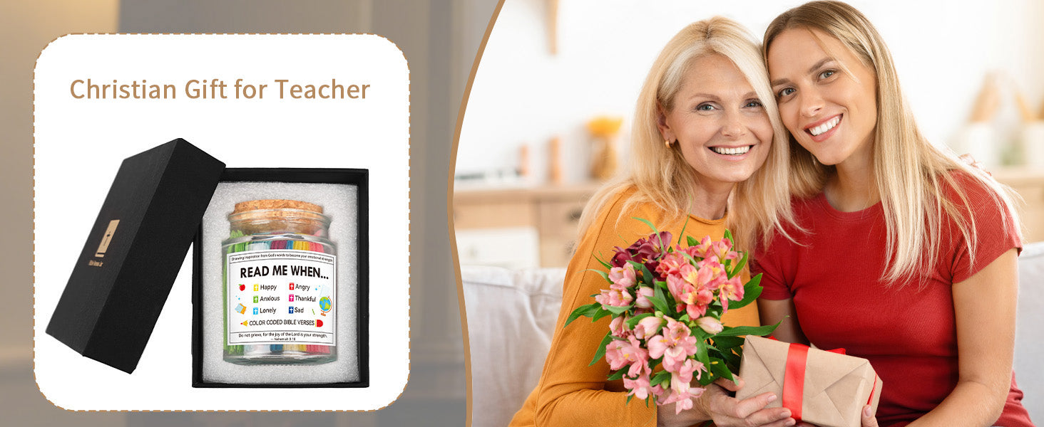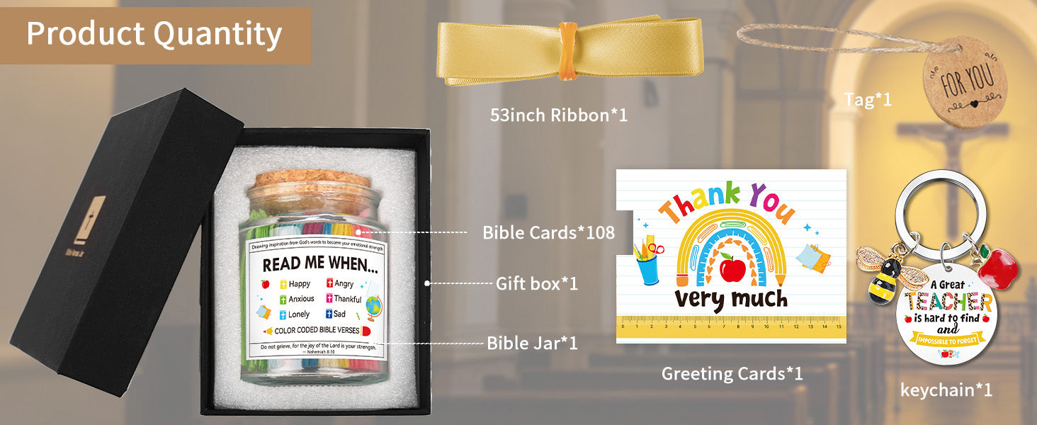 - What You will Get: You will receive a jar with bible verses, an elegant gift box with a cross design, a heartfelt keychain with a teacher appreciation message, a champagne colored satin ribbon, and a colorful thank-you greeting card—making it a meaningful and hassle-free present