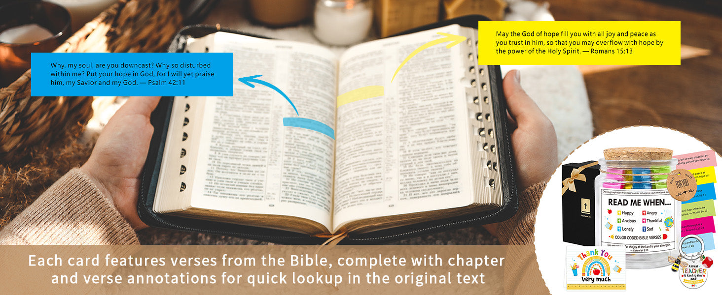 - 108 Inspirational Bible Verses: Our bible verse jar contains 108 carefully selected scriptures, each scripture card is color-coded to provide inspiration during different emotional moments—whether feeling happy, anxious, lonely, angry, thankful, or sad. Help teachers find daily strength and motivation through God’s words