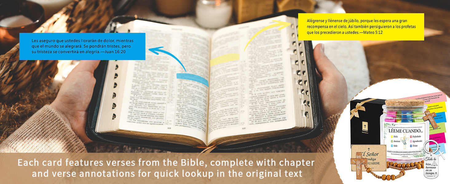 - 108 Inspirational Bible Verses: Our Bible Verse Jar contains 108 carefully chosen scripture cards in Spanish, each color-coded to provide inspiration for different emotions: happiness, anxiety, loneliness, anger, thankfulness, and sadness. A perfect way to find daily encouragement through God’s word